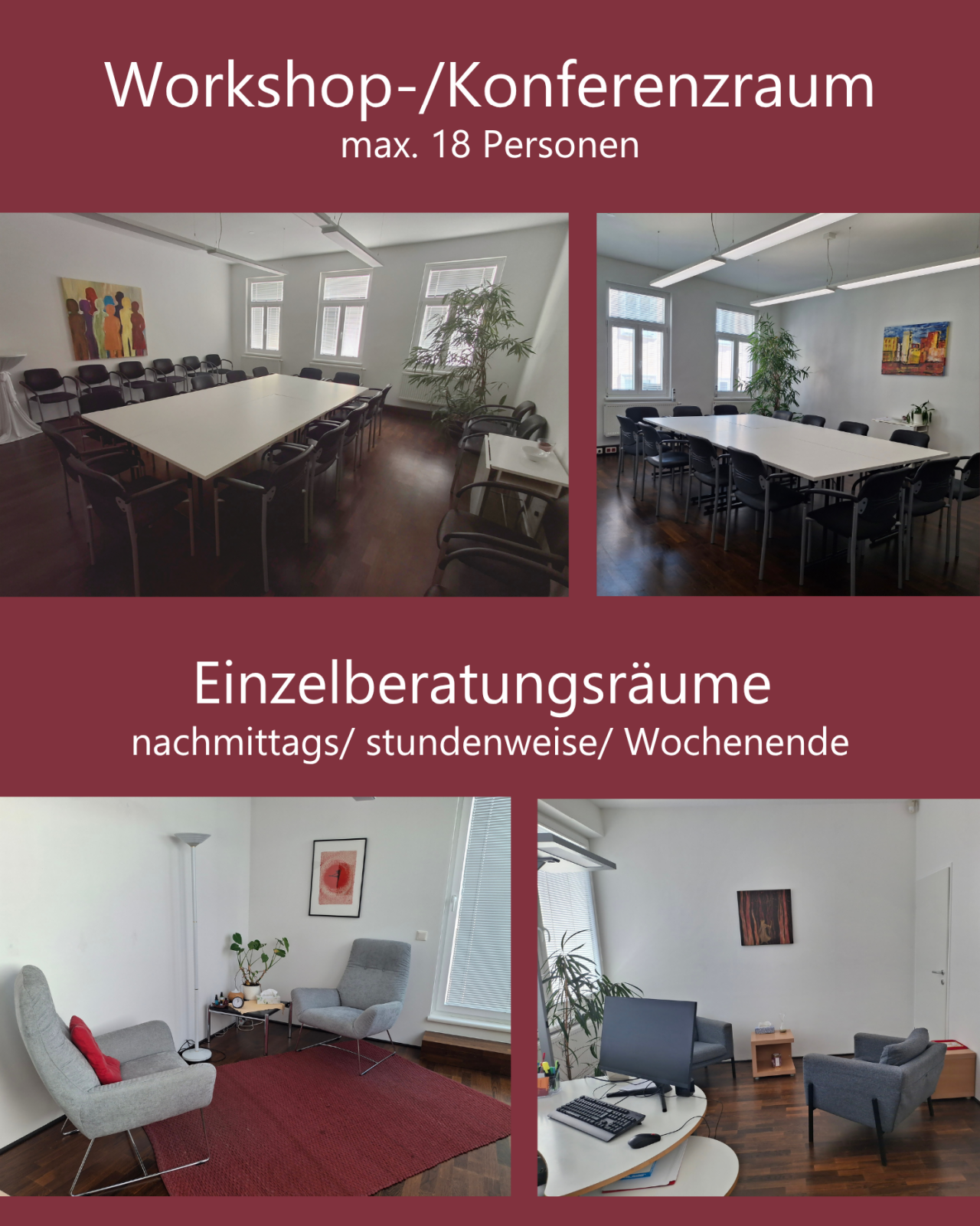 Wir haben mehrere Einzelberatungsräume und einen großen Besprechungsraum, welche angemietet werden können. Bei Interesse melden Sie sich gerne bei uns!